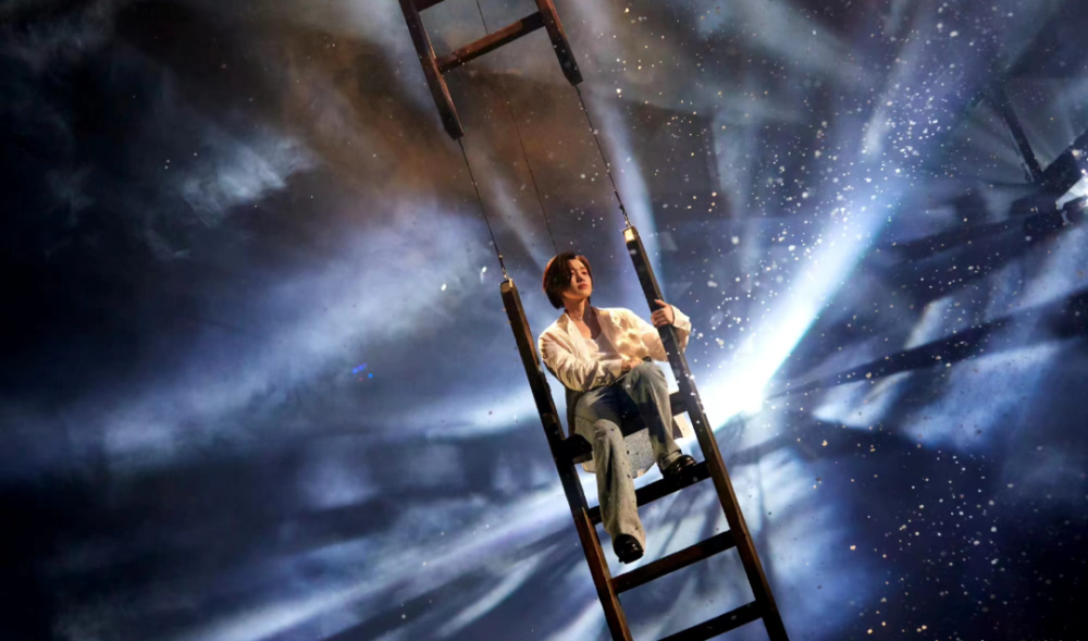 第二次公演的舞台上,邓典穿着白衬衫牛仔裤亮相。《水星记》前奏响起,他坐在半空中,唱着“还有多久才能跟你接近”。听完这首歌,同为选手的妙莎哭了,“他的舞台(给人)那种很孤单的感觉”。