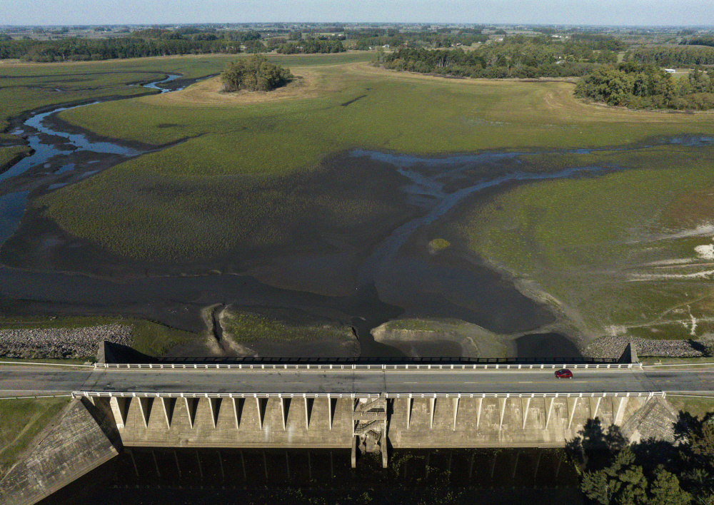 当地时间2023年5月15日,乌拉圭卡内洛内斯,Canelon Grande水库。乌拉圭持续的干旱导致蒙得维的亚和大都市区的饮用水严重盐碱化,附近水库的水位下降。