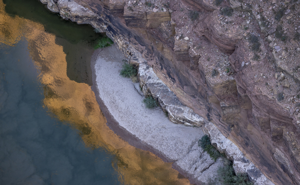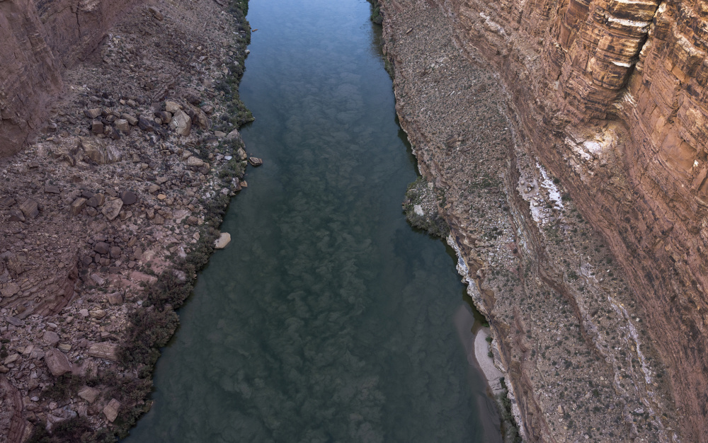 当地时间2022年8月31日,美国亚利桑那州大理石峡谷,当沉积物在流经鲍威尔湖下游的大理石峡谷时,红色砂岩悬崖倒映在科罗拉多河中。近几年,气候变化导致的干旱使美国第二大水库鲍威尔湖的水位下降。