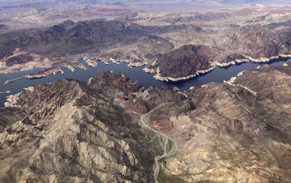当地时间2023年3月6日,美国内华达州博尔德市,沿着内华达州和亚利桑那州的边界,“浴缸环”显示了米德湖的水位线。