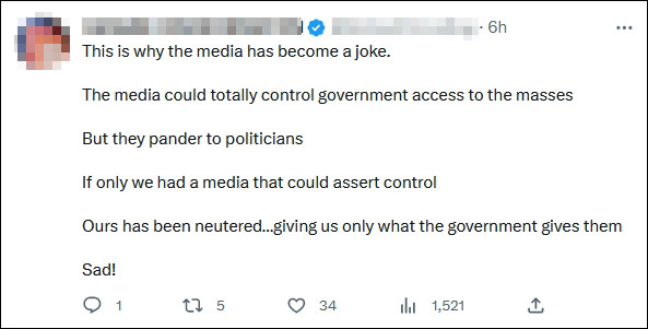 一名网友在推特上写道:“媒体完全可以控制公众对政府的了解,但他们选择迎合政客……我们的媒体被‘阉割’了,只给我们看政府提供给他们的事情。悲哀!”