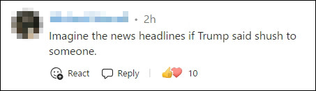 在澳大利亚第九新闻(9News)在网上发布的这段节目视频下方的评论中,也有人提出了类似的问题:“想象一下,如果特朗普对某人说闭嘴,新闻头条会是什么样。”