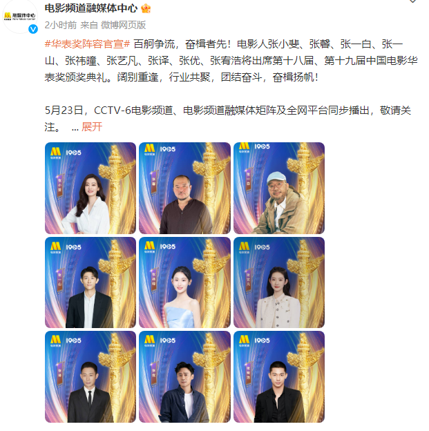 第十八届十九届华表奖颁奖典礼将于5月23日在北京举行,两届奖项一起揭晓,数百位影人嘉宾将集结出席。