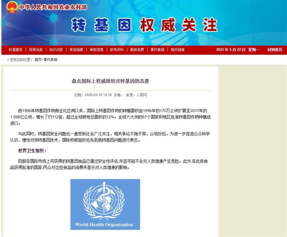 极目新闻记者查询发现,2020年3月,农业农村部官网转载了人民网“盘点国际上权威组织对转基因的态度”的一篇文章,列举了众多国际权威组织对转基因食品的态度。