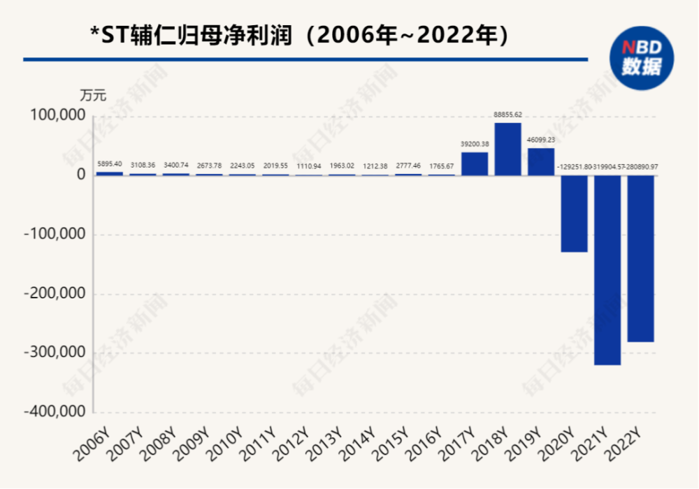 拖到4月28日才披露的*ST辅仁2022年年报已经显露出颓败之迹:去年公司营收约为14.69亿元,同比减少2.9%,亏损同比收窄12.20%但绝对金额仍超28亿元。同时,截至公司净资产同比减少351.11%至﹣20.09亿元,已严重资不抵债。