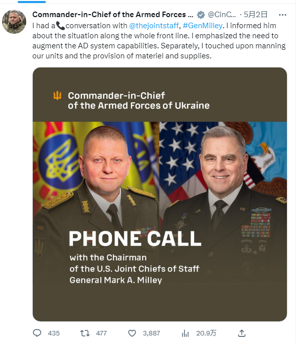 在他的推特账号上可以看到,最新一次更新是5月2日,内容是与美国参联会主席米利通电话,通话内容大概就是双方讨论要继续加强防空系统的能力。