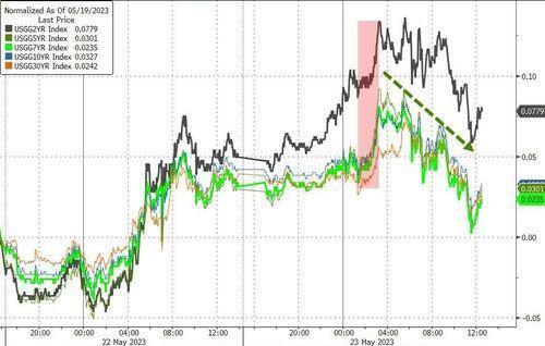 两年期美债收益率一度涨11个基点,至逾两个月新高,尾盘因债务谈判僵局冲高回落