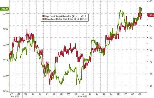 市场预期美国利率在高位维持更长时间,衡量兑六种主要货币的一篮子美元指数DXY最高涨0.4%至103.65,连续多日站稳103关口上方,连涨两日、再创 3月20日以来的逾两个月新高。但有分析称,达成债务上限协议后,美元会因市场的风险偏好重燃而下跌。