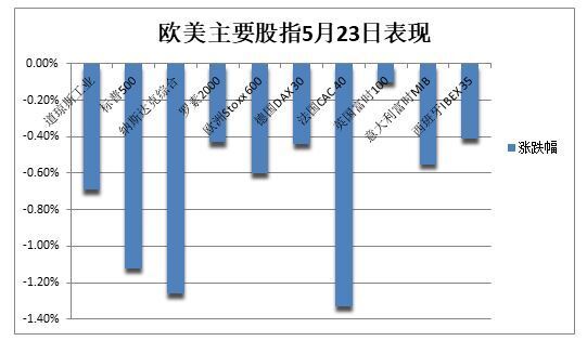欧股齐跌,工业类股下跌1.3%,油气股逆市上涨1%。泛欧Stoxx 600指数收跌0.6%,欧元区Stoxx 50指数跌近1%。德国股指连续两日跌离上周五所创的收盘新高,法股跌超1.3%垫底。