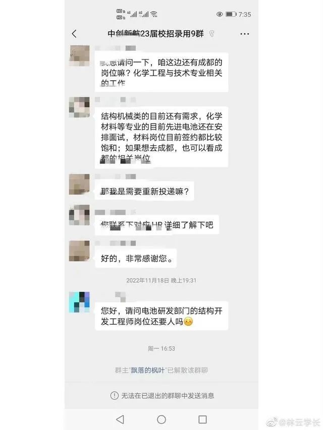 周同学表示,自己是在24日下午接到解约通知的。“下午2点40左右,相关群聊突然被解散,没有发布任何公告。一个多小时之后,我就收到了解约电话和邮件,理由是岗位变动,让我提供银行卡账号,说会赔偿3000元违约金。”“我加入了一个中创新航全国被解约应届生的群,目前里面已经有600多人了。”