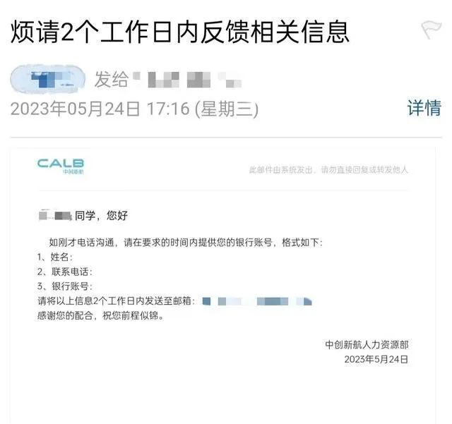 另据海报新闻报道,来自南宁某高校车辆工程本科专业的一位刘同学也表示,去年11月参加了中创新航的校招拿到了offer,期间也拒绝了好几家公司。今年5月23日,人力资源部发信让把一些号码设置为白名单,结果5月24日下午收到解约的电话,并收到邮件。本以为是沟通联系入职的,真没想到在即将毕业的时候被告知解约。