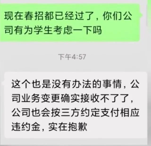 “目前我们有四个诉求,第一个是给出合理解释,第二个是对解约再重新考虑,第三个是提高违约金力度,最后是希望其他企业注意到这一情况,提供就业机会。”小李说。