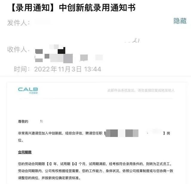 一位周同学表示,自己在11月接到中创新航成都分公司的录用通知,当时对方还很着急地催促三天之内考虑好,签订三方协议由于当时还没毕业,并未签订正式劳动合同,但签订了三方协议。