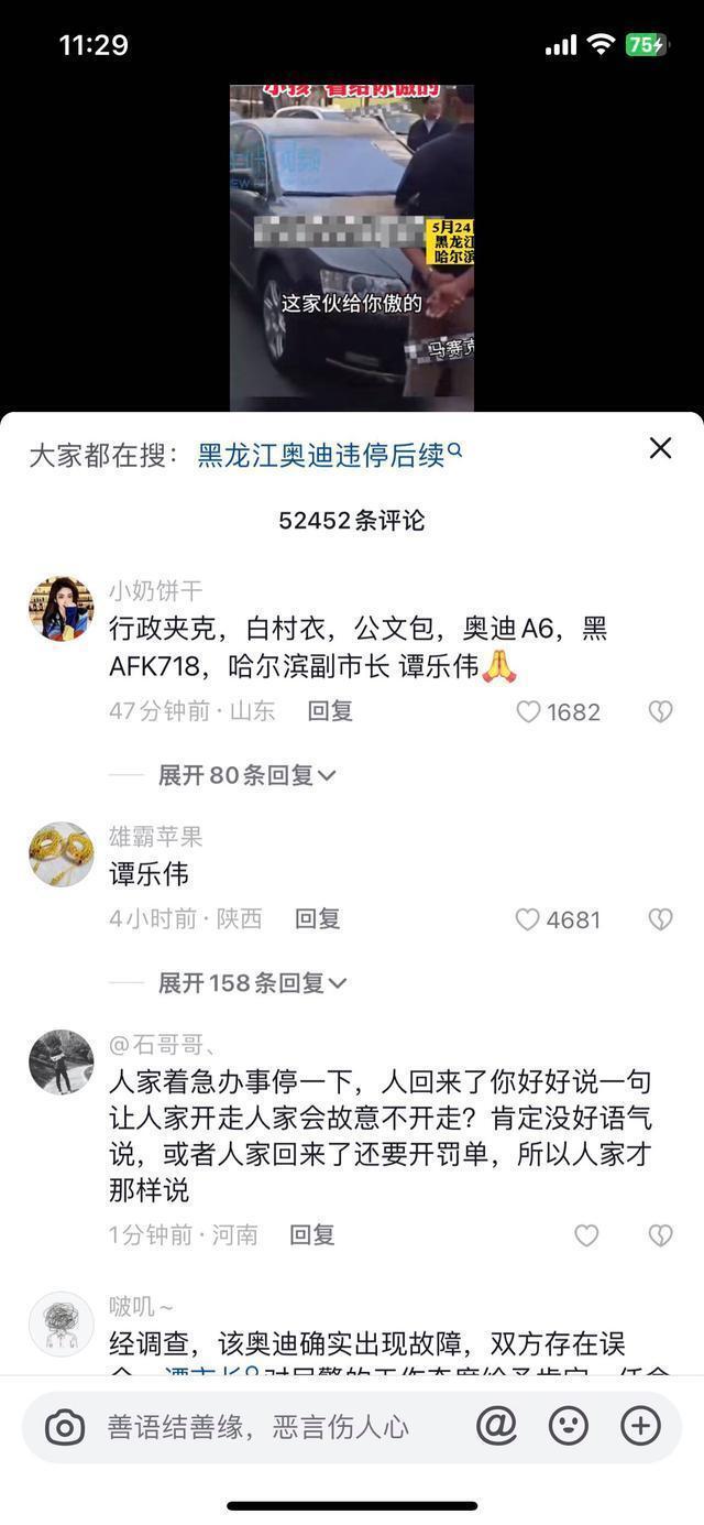 由于视频中男子身着黑色夹克佩戴公文包,且开着黑色奥迪,不少网友称上述男子为哈尔滨市副市长谭某某。
