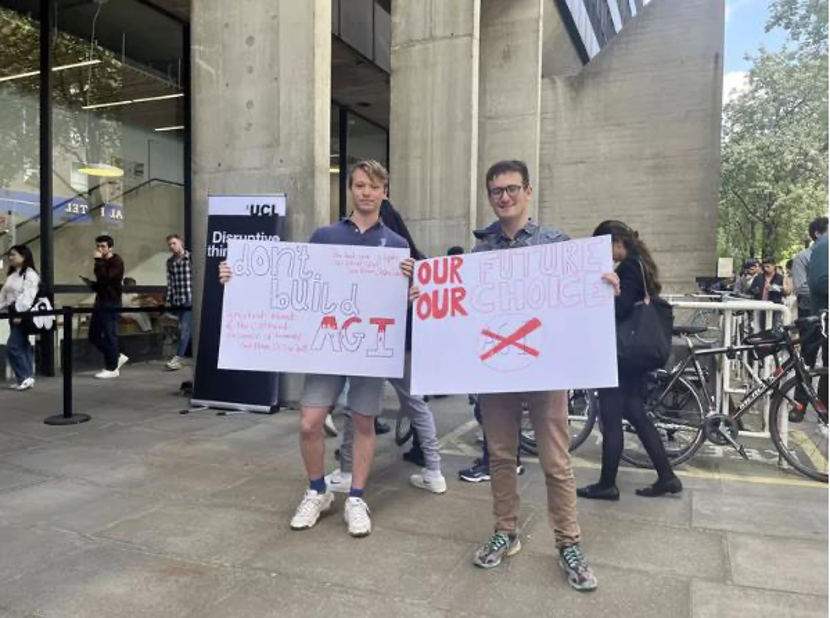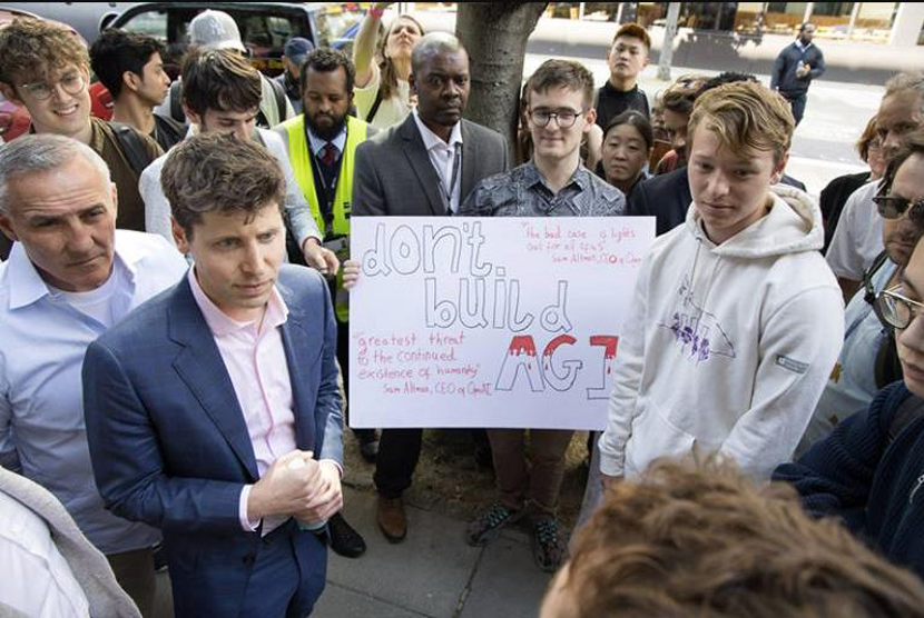 无论走到哪里,奥特曼都会受到热烈欢迎,当然也不乏质疑。在伦敦大学学院演讲时,许多抗议者就曾发出严厉警告:OpenAI和像它这样的公司需要停止开发先进的人工智能系统,以免它们有机会伤害人类。