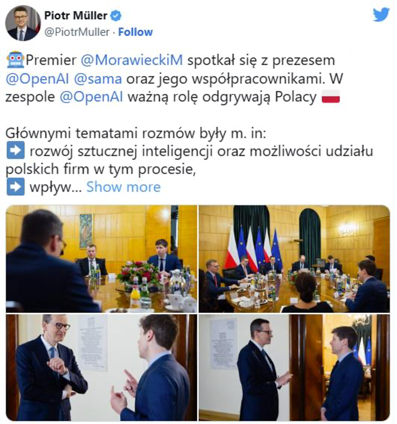 随后,奥特曼前往波兰,见到了波兰总理马泰乌什·莫拉维茨基(Mateusz Morawiecki),两人的讨论主要围绕探索波兰公司参与人工智能开发过程的可能性展开。他们强调了开发符合社会价值观的人工智能技术的重要性,确保人工智能的使用合乎道德规范,并担负起责任。