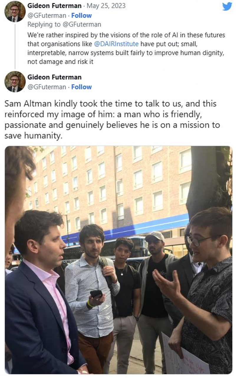 牛津大学研究太阳能地球工程和生存风险的学生吉迪恩·富特曼(Gideon Futerman)评价奥特曼说:“听着,也许他是在制造骗局,我当然希望他仅止于此。但在当前情况下,他是在炒作有足够已知危害的系统,我们要竭尽全力阻止他。如果他是对的,他正在构建的系统通常是通用人工智能,那么危险就会大得多。”