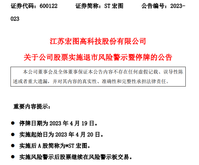 公告称,公司于 2023 年5月26日收到上海证券交易所下发的《关于拟终止江苏宏图高科技股份有限公司股票上市的事先告知书》(上证公函【2023】0615 号),具体内容如下: