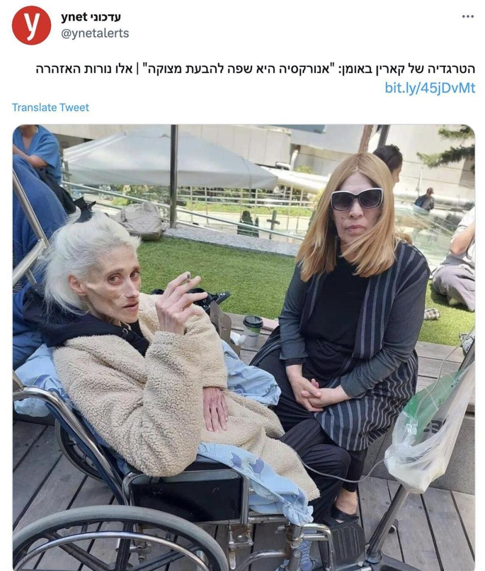 “我为已故的卡琳·鲍曼的去世感到悲伤,她在过去的十年里勇敢地面对着可恶的厌食症。”以色列妇女进步部长梅·戈兰在一条推文中写道,并附上了鲍曼和母亲的照片。