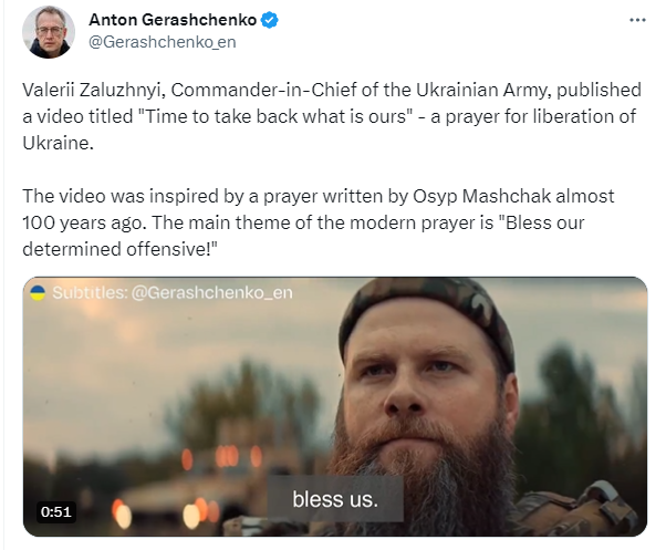 乌克兰内政部顾问安东·格拉什琴科在推特发文称,该视频是为了“解放乌克兰”而作的祈祷,主题是“保佑乌军坚定的进攻”,灵感来源于乌克兰民族主义政治家和活动家奥西普·马尔沙克约100年前写下的祈祷文。