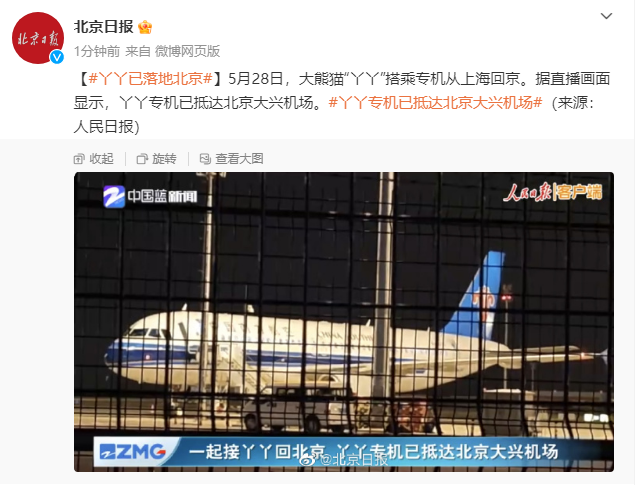 5月28日,大熊猫“丫丫”搭乘专机从上海回京。据直播画面显示,丫丫专机已抵达北京大兴机场。