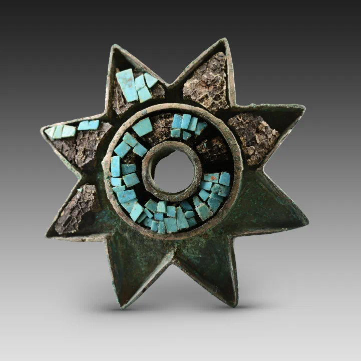 较为重要的有M1出土的铜车马器,铜铃、铜轭首、铜觽形器、镶绿松石铜八角形衡饰、衡末饰、铜泡等,组合完整,位置清楚。M3出土兽面纹骨柶,长45厘米,正面雷纹衬地,由五组兽面纹组成,以绿松石点缀兽面角、目、鼻,工艺精湛,与殷墟王陵区M1003大墓出土器物极为相似。M4出土三件云形金耳饰,是极具地方特色的一类金器。此外还有铜镞、铜斧、海贝、玉器、鳄鱼骨板等器物。