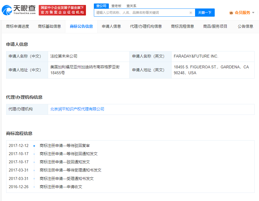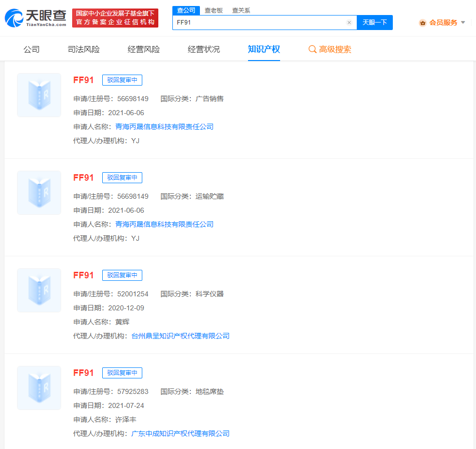 天眼查App显示,“FF91”已被多方申请注册商标,申请人包括法拉第未来公司以及多家服饰、科技公司和自然人,国际分类涉及运输工具、广告销售、餐饮住宿等。其中,法拉第未来公司申请的运输工具类“FF91”商标于2017年被驳回复审,现为无效状态,自然人孙某某则已成功注册广告销售类“FF91”商标,其余申请人申请的商标也多被驳回。