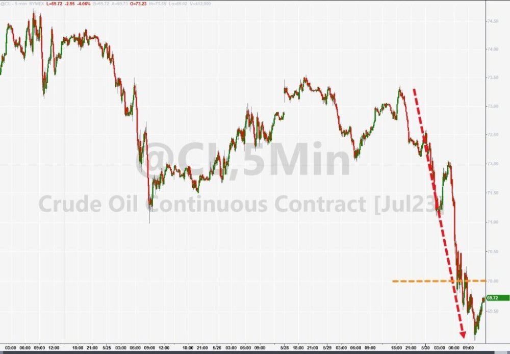最终,WTI 7月原油期货收跌3.21美元,跌幅4.42%,报69.46美元/桶,5月4日以来首次收盘跌穿70美元;布伦特7月原油期货收跌3.41美元,跌幅4.43%,报73.54美元/桶,和美油均收创5月4日以来新低、均创5月2日以来最大收盘跌幅。