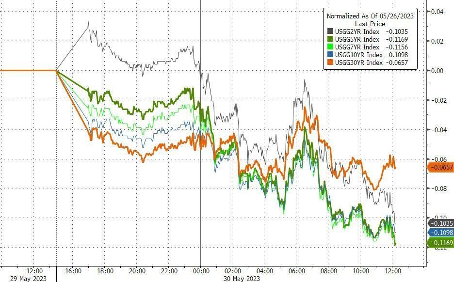 上周末白宫和共和党达成美国债务上限原则性协议后,周一休市的6月初到期美国短债收益率延续上周五的回落势头。6月6日、即美国财长耶伦最新警告的债务违约到来日次日到期的美债收益率周一盘中降至约5.2%,远离上周一度约7%的高位。
