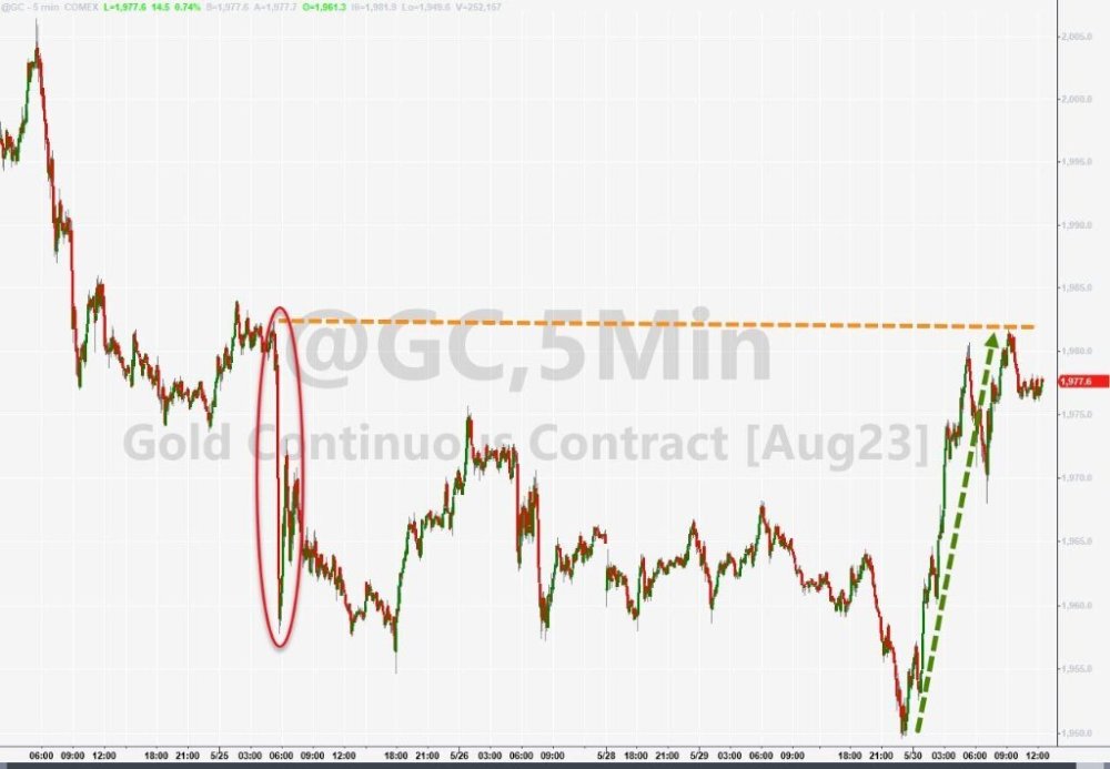 纽约黄金期货主力合约8月合约在欧股盘前曾跌至1949.6美元刷新日低,日内跌近0.7%,欧股早盘转涨后持续回涨,美股盘中曾涨至1981.9美元,日内涨近1%。
