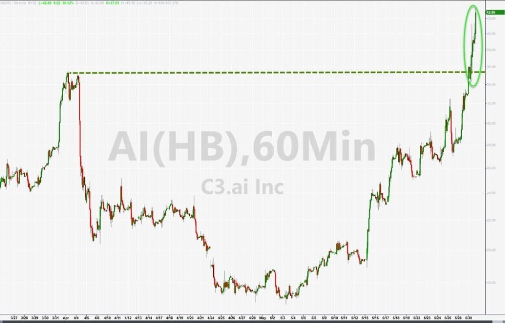 AI概念股盘初全线大涨,部分到收盘保持涨势,部分盘中转跌。宣布旗下生成式AI在亚马逊AWS Marketplace软件平台上架的C3.ai(AI)收涨33.4%,连涨四日,创2021年11月以来收盘新高;SoundHound.ai(SOUN)收涨9.1%;Palantir(PLTR)收涨近7.8%;Adobe(ADBE)盘初曾涨近超4%,收涨0.4%;而BigBear.ai(BBAI)盘初曾涨超6%,早盘转跌,收跌9.4%;有望为英伟达AI芯片H100提供电源管理解决方案的Monolithic Power Systems(MPWR)盘初曾涨超6%,收跌1.1%。