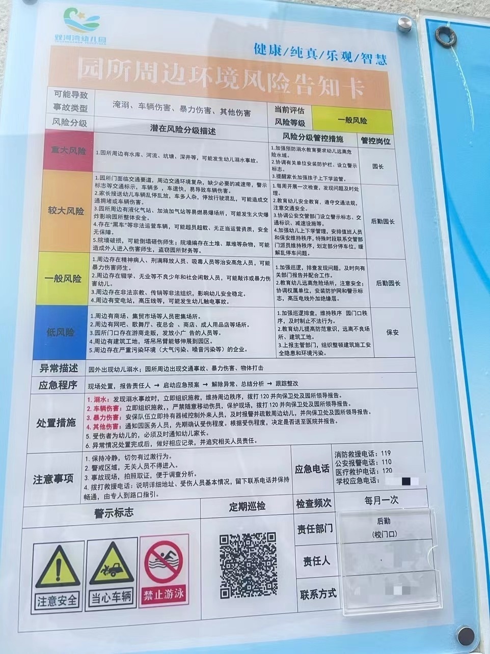 张贴在幼儿园门口侧面的《园所周边环境风险告知卡》。图/九派新闻杨冰钰