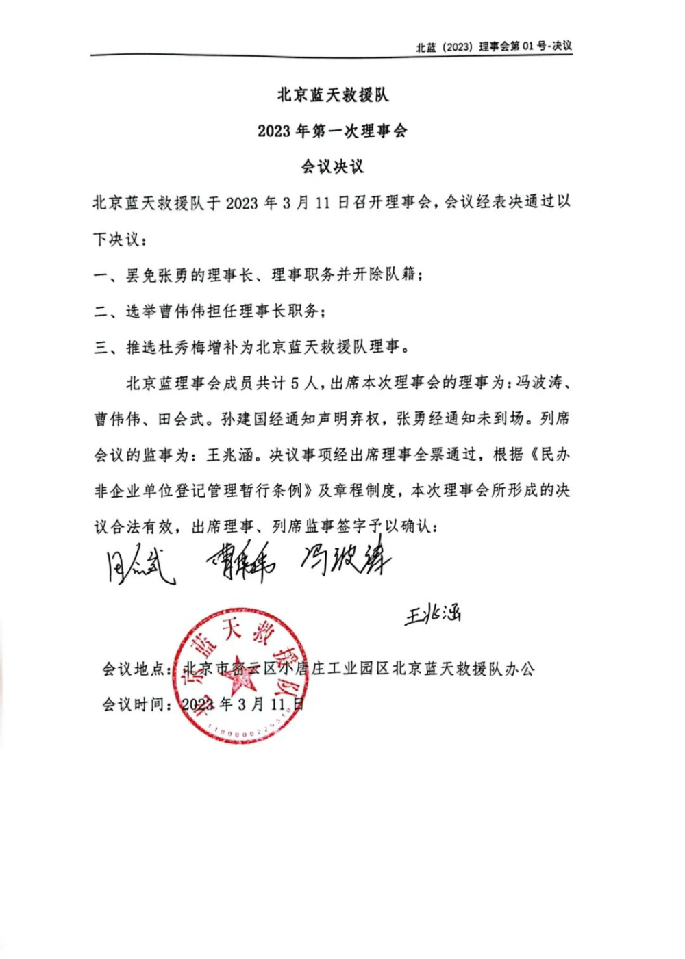 北京蓝天救援队“控制权”再起争议:原理事长张勇被罢免和开除