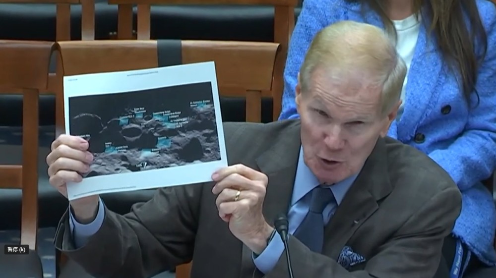 尼尔森在听证会上展示月球南极环形山照片 图自视频截图