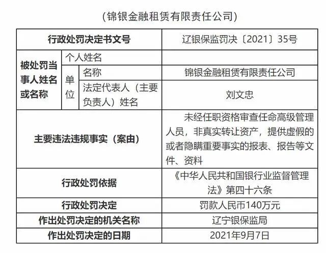 值得一提的是,2021年9月7日,辽宁银保监局对锦银租赁及其法定代表人开出行政处罚单,因为其未经任职资格审查任命高级管理人员,非真实转让资产,提供虚假的或者隐瞒重要事实的报表、报告等文件和资料,罚款140万元。