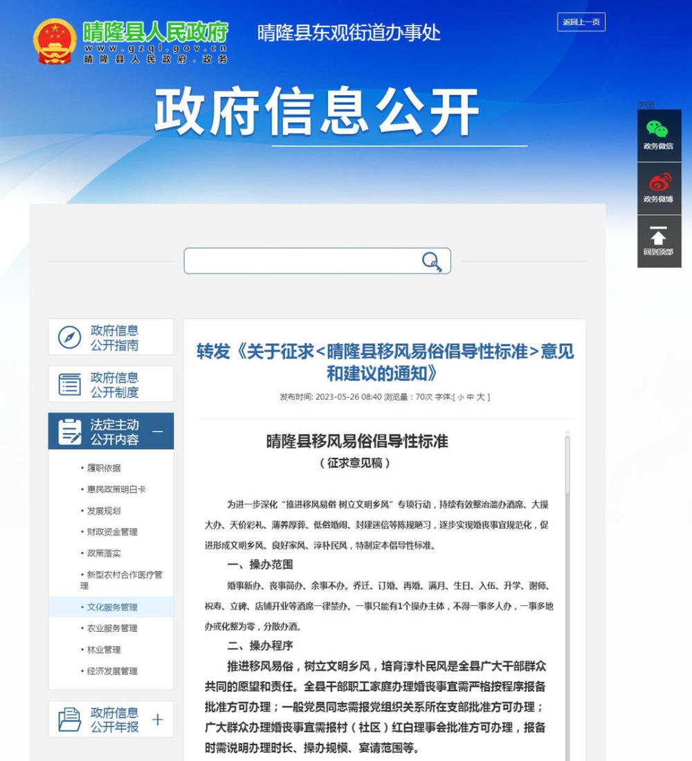 6月2日,红星新闻记者在晴隆县政府官网上,已找不到晴隆县精神文明委员会办公室5月29日发布的关于公开征求《晴隆县移风易俗倡导性标准》意见和建议的通告。但更早之前的5月26日,晴隆县东观街道办转发了该通告。