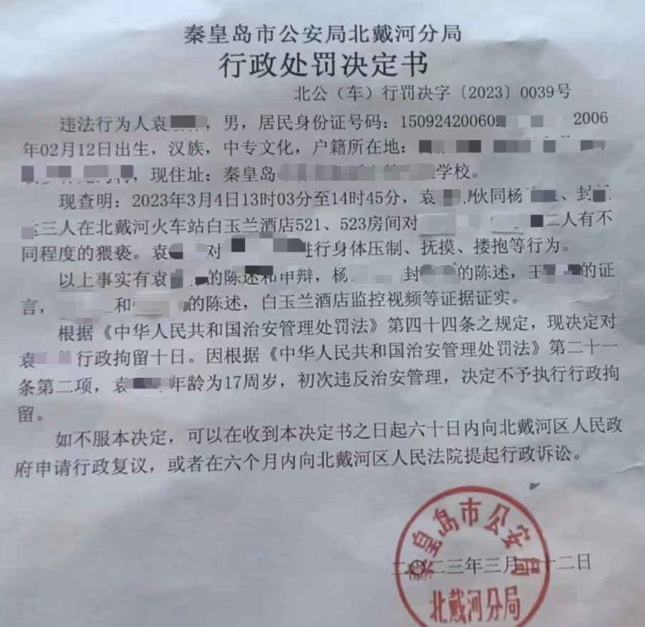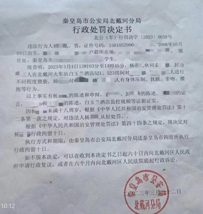 小可监护人介绍,事发当天2名受害少女的家长都在外地工作,不在秦皇岛。接到小可求助电话后,家属当晚10点左右向事发地秦皇岛市公安局110进行了刑事报案。小可家属提供的北戴河分局行政处罚决定书显示,3月22日,当地警方对涉事的3名涉案人员均做出了行政拘留十日的治安处罚决定。