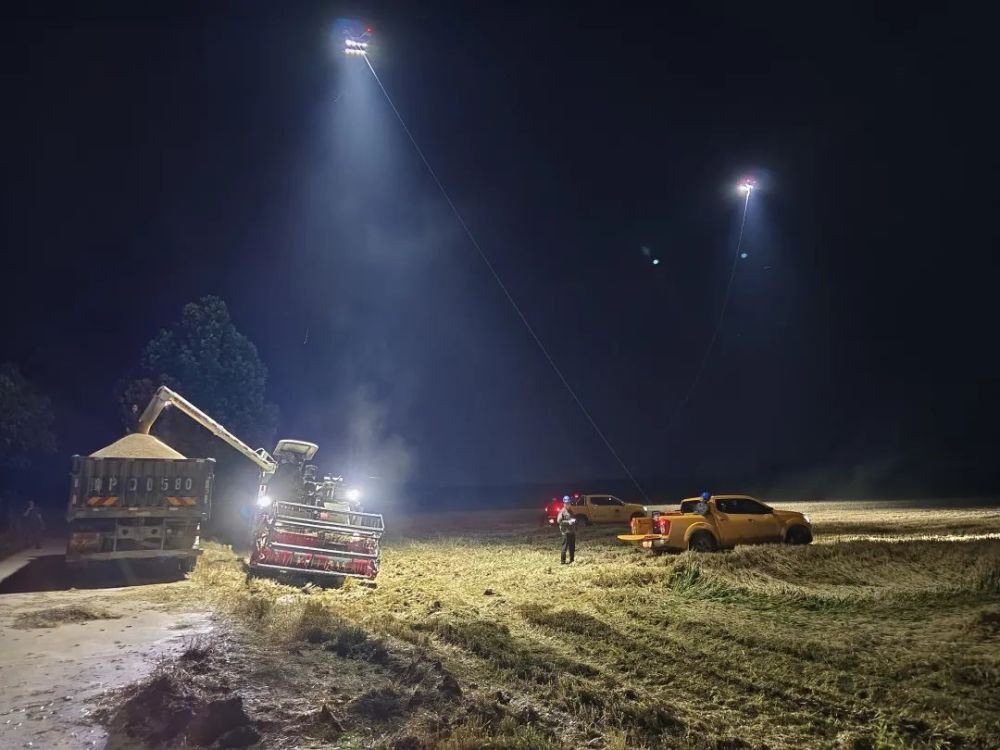 河南省驻马店市上蔡县黄埠镇苑坡村,在电力部门提供的无人机照明助力下,当地村民趁夜抢收小麦。农民日报·中国农网记者 王帅杰 摄