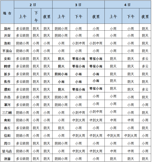 根据预报,此次过程降水时段集中在3日下午到4日白天,过程累计降水量西南部、南部20到40毫米,部分县市50到80毫米,中部偏南地区15到20毫米。黄河以南其他地区有小到中雨,降水量5到15毫米。新乡、焦作、济源有阵雨,降水量2到5毫米。安阳、鹤壁、濮阳以多云为主,有分散性小阵雨。
