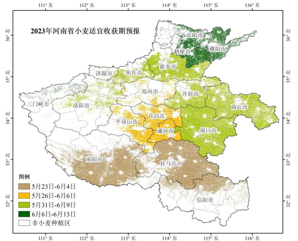 根据河南省气象台早前发布的消息,今年我省小麦适宜收获期预计在5月23日-6月13日,大部地区接近常年,豫南地区略提前。其中:信阳、南阳、驻马店适宜收获期在5月23日-6月4日;漯河、平顶山、许昌、郑州适宜收获期在5月26日-6月6日;周口、商丘、开封、新乡、焦作、洛阳、济源适宜收获期在5月31日-6月9日;三门峡、鹤壁、濮阳、安阳适宜收获期在6月6日-13日。