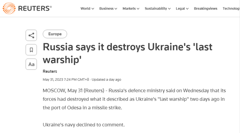路透社以“俄罗斯说击毁乌最后战舰”为题进行了报道。