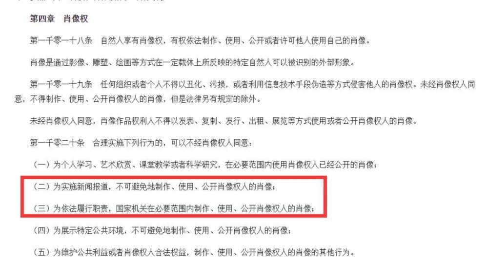 《中华人民共和国民法典》第一千零二十条明确规定,为实施新闻报道,不可避免地制作、使用、公开肖像权人的肖像;为依法履行职责,国家机关在必要范围内制作、使用、公开肖像权人的肖像,可以不经肖像权人同意。
