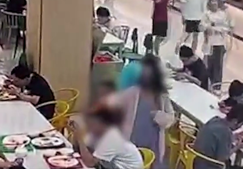监控视频显示,该女生坐在旁边,将烤鸭饭扣在男生头上后离去,随后三位男生追了上去。
