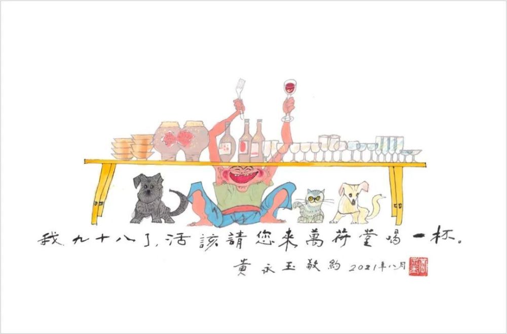黄永玉98岁时作的画,上面题着「我九十八了,活该请您来万荷堂喝一杯。」