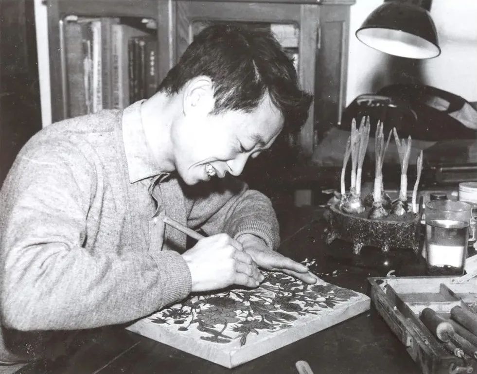 1962年在校尉营美院宿舍,黄永玉正在刻「繁花」 受访者供图