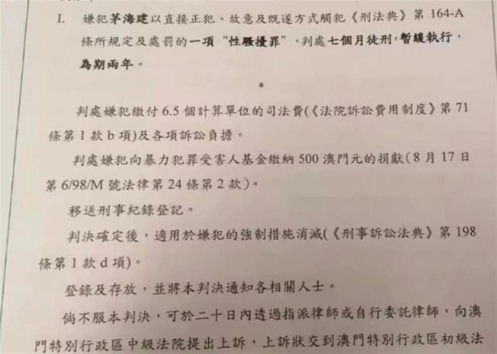 案发近一年后,澳门法院近日作出判决,涉案教授身份曝光,原来是2015年起任澳门大学特聘教授的华东师范大学历史系教授茅海建。网传的判决书称:茅海建以直接正犯、故意及既遂方式触犯《刑法典》“性骚扰罪”,判处7个月徒刑,暂缓执行,为期2年。判决书称,茅海建需缴付诉讼费,向暴力犯罪受害人基金捐款500澳门元,并移送刑事记录登记。若不服判决,可于20日内上诉。