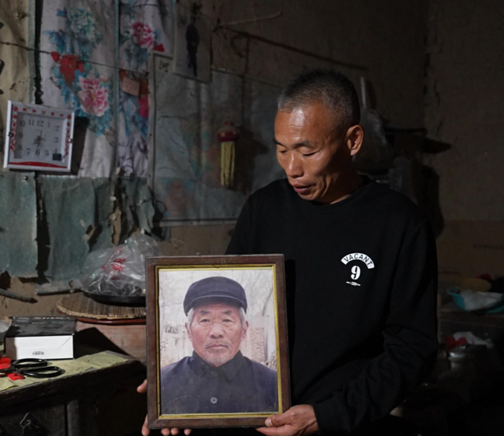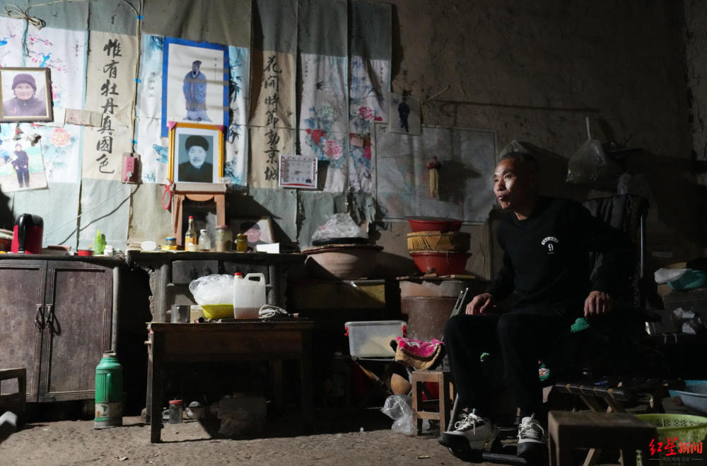谢哲海从砖洞取出钥匙,门“咯吱”一声被推开,农具及一些老物件散布在房间各个角落,正对着的柜子上摆放着爷爷和父亲的照片,已蒙上厚厚灰尘。早几年,谢哲海和哥哥爬到房顶盖了层塑料布,用来应对暴雨季节漏水,屋内同样有一块塑料布悬在床上方,用来兜住屋顶掉落的泥土。