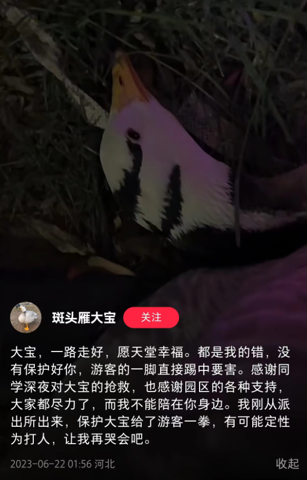 一直更新大宝动态的发布者在此事发生后公布了“大宝”的死讯,他表示,因为晚上模糊,根据之前的情况来看,“大宝”应该是冲到游客身旁停下来,未攻击,但后来被踢飞了。