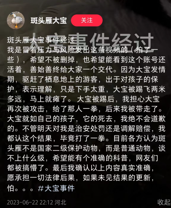 目前,相关调查结果还未出来,只有一点无有争议,斑头雁大宝是无辜的。