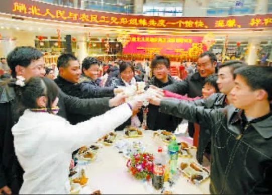 2008年2月6日,多名滞留在沪的外来务工者在长途客运大厅吃了一顿别开生面的年夜饭。(资料图 金定根 摄)